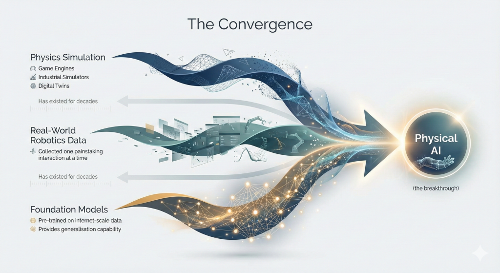 We’ve had physics simulation for decades: game engines, industrial simulators, digital twins. We’ve had real-world robotics, collecting data one painstaking interaction at a time. And we’ve had machine learning, pattern-matching on whatever data was available. Each existed in isolation. None was sufficient alone.