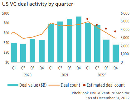 Pitchbook’s preliminary Q4 numbers for US Venture Capital activity are now out. They show last quarter’s investment activity (measured in number of deals) down by 25% from Q1. But they also show activity higher than any other quarter in the past ten years.
