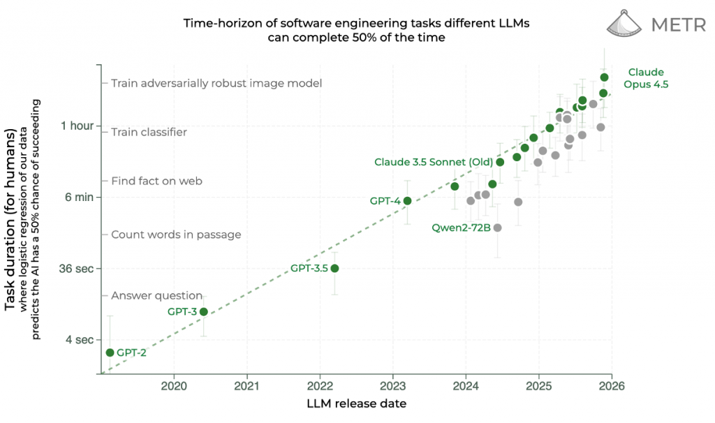 Extrapolate conservatively and you reach 13–14 hours by end of 2026. That’s a full working day of autonomous operation. The constraint shifts from “can AI do complex tasks?” to “can we verify the work was done correctly?” Oversight becomes the bottleneck.